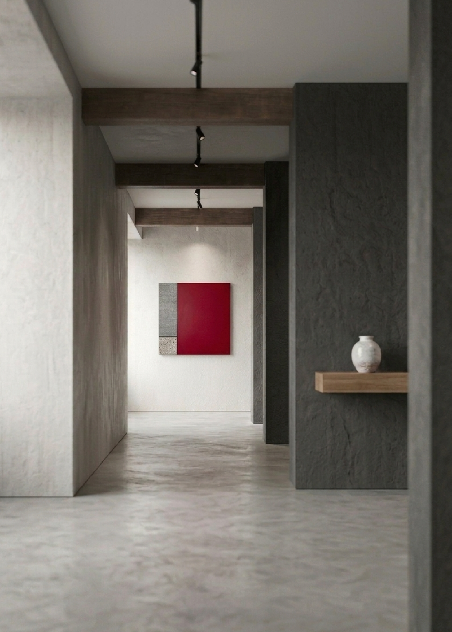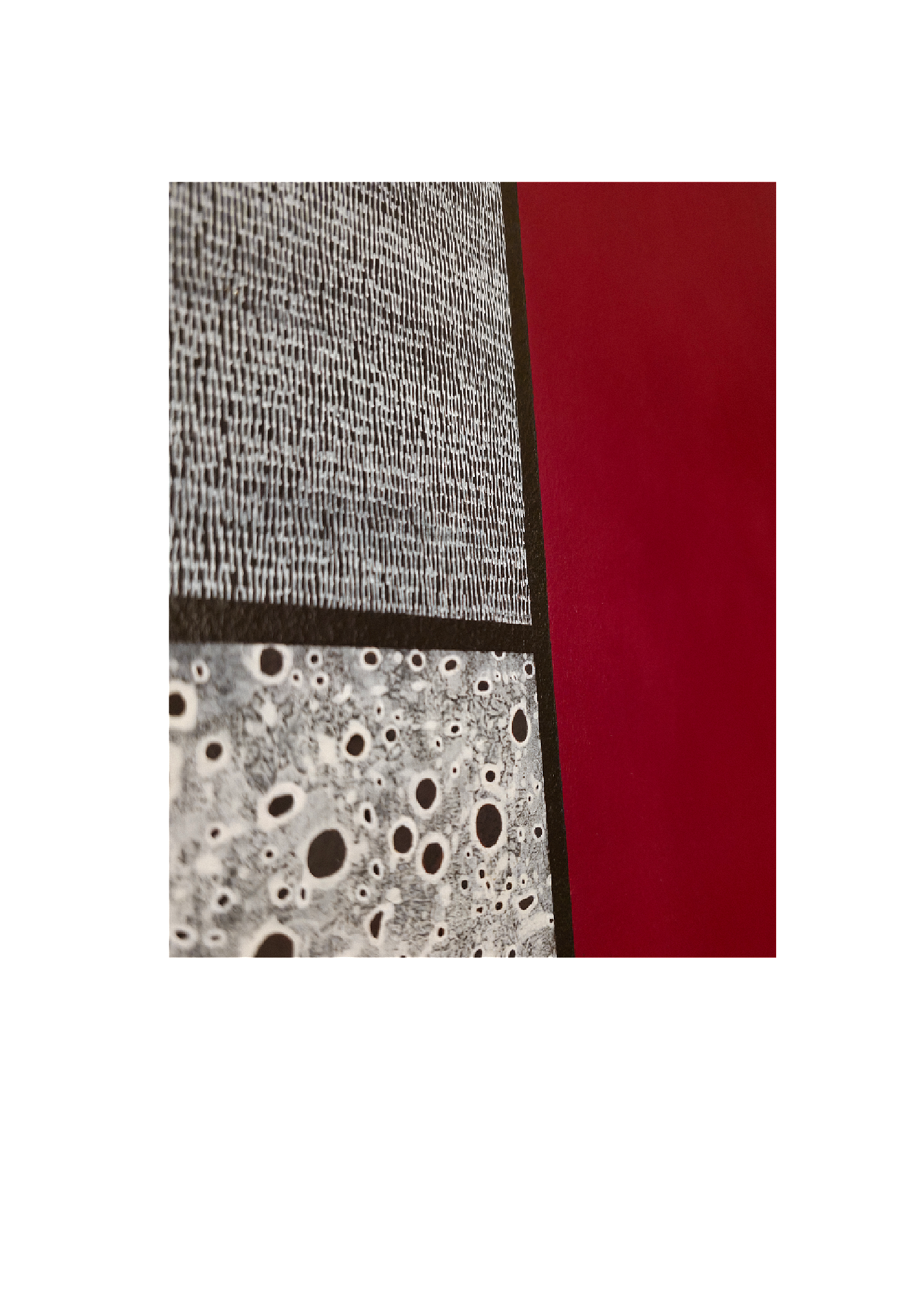 La composition de la toile se déploie avec une rigueur particulière. Un rouge vibrant occupe le centre de la narration visuelle, tandis que les plans s’assombrissent vers un marron profond. Des traits blancs viennent ensuite structurer les masses sombres pour y apporter une lumière graphique. En bas de l’œuvre, des projections organiques créent une respiration moderne. Ce jeu de textures et de superpositions offre une profondeur que chaque variation d’éclairage vient révéler au fil de la journée.