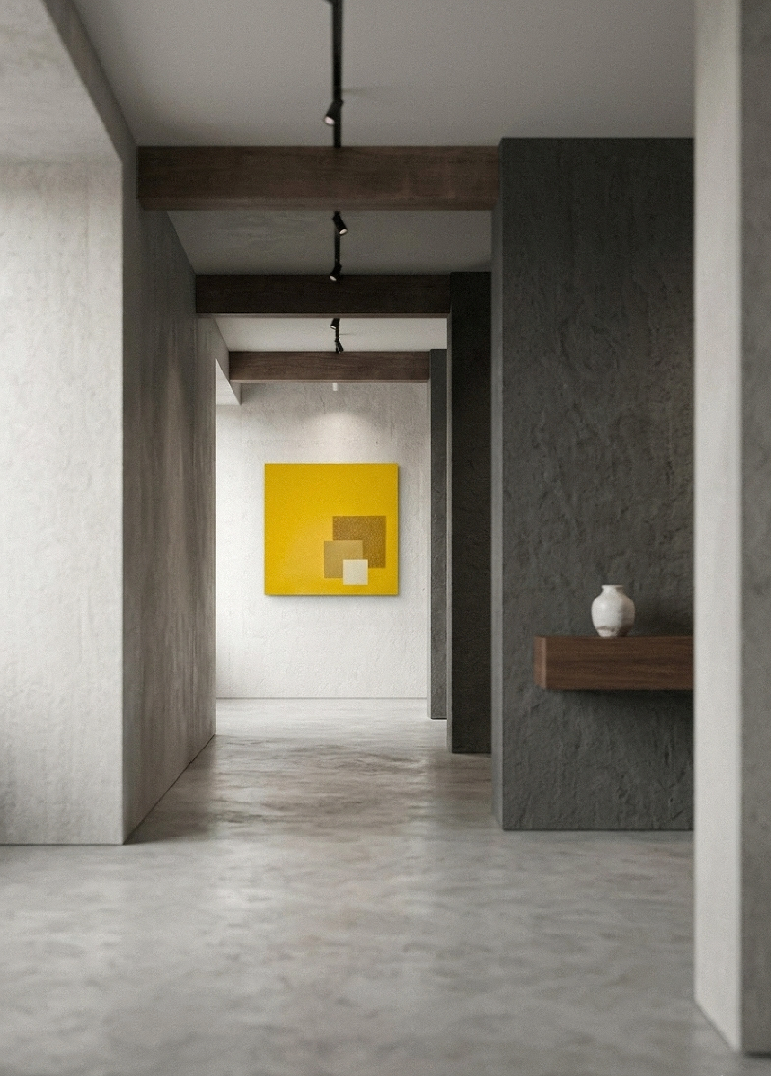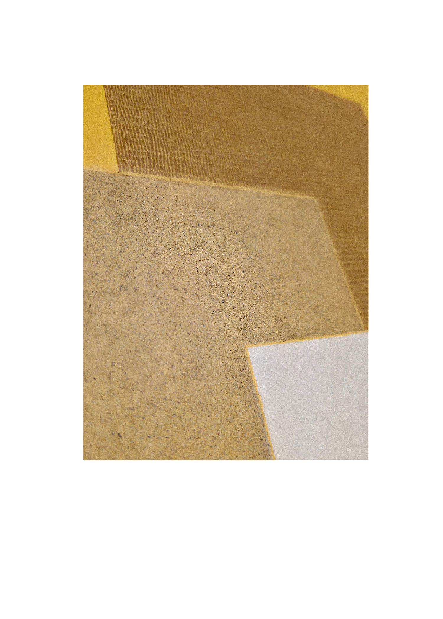 La composition se déploie avec une rigueur géométrique singulière. Un jaune vibrant occupe la majeure partie de la narration visuelle, tandis que les plans se complexifient par un jeu de superpositions de carrés. Des traits or-bruns et un carré de sable structurent ces masses, apportant une lumière graphique et une dimension organique à l’ensemble. Ce jeu de textures offre une profondeur que chaque variation d’éclairage vient révéler au fil de la journée.