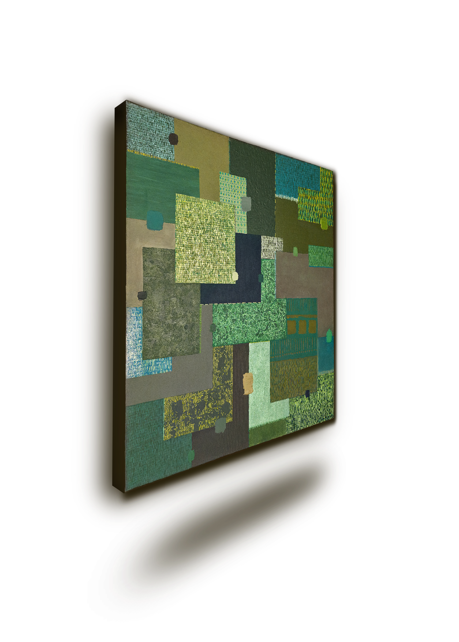 La composition se structure autour d’une architecture de blocs. Vous y trouverez des teintes émeraude, olive et ocre. Cette peinture originale verte se distingue par une exécution d’une rare précision. Des milliers de traits ont été tracés à la main, un par un. Ce geste insuffle une énergie vibratoire à chaque segment. Ce travail de patience crée une profondeur texturale unique. Tandis que les couleurs ancrent l’œuvre au sol, les détails apportent une légèreté aérienne.