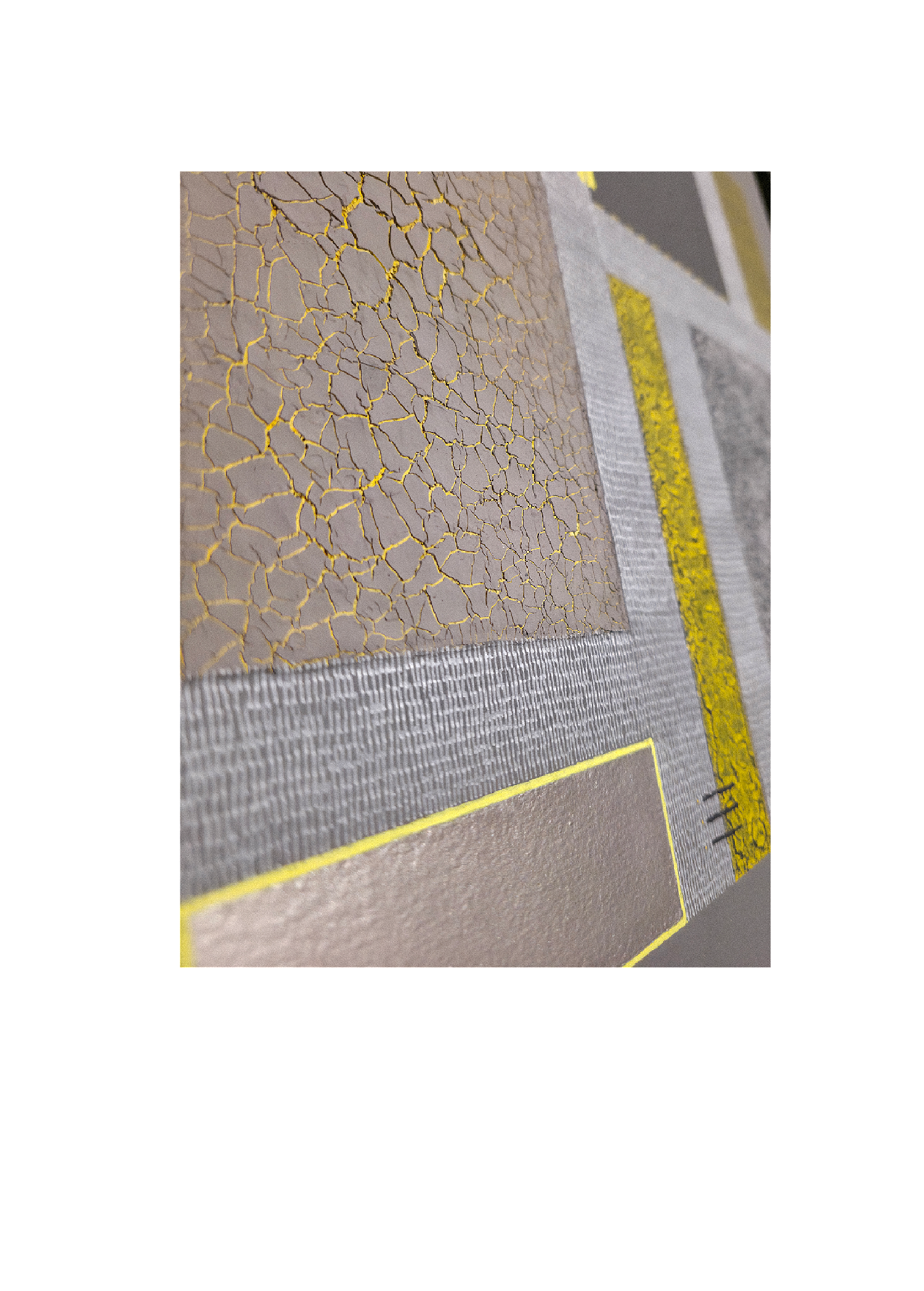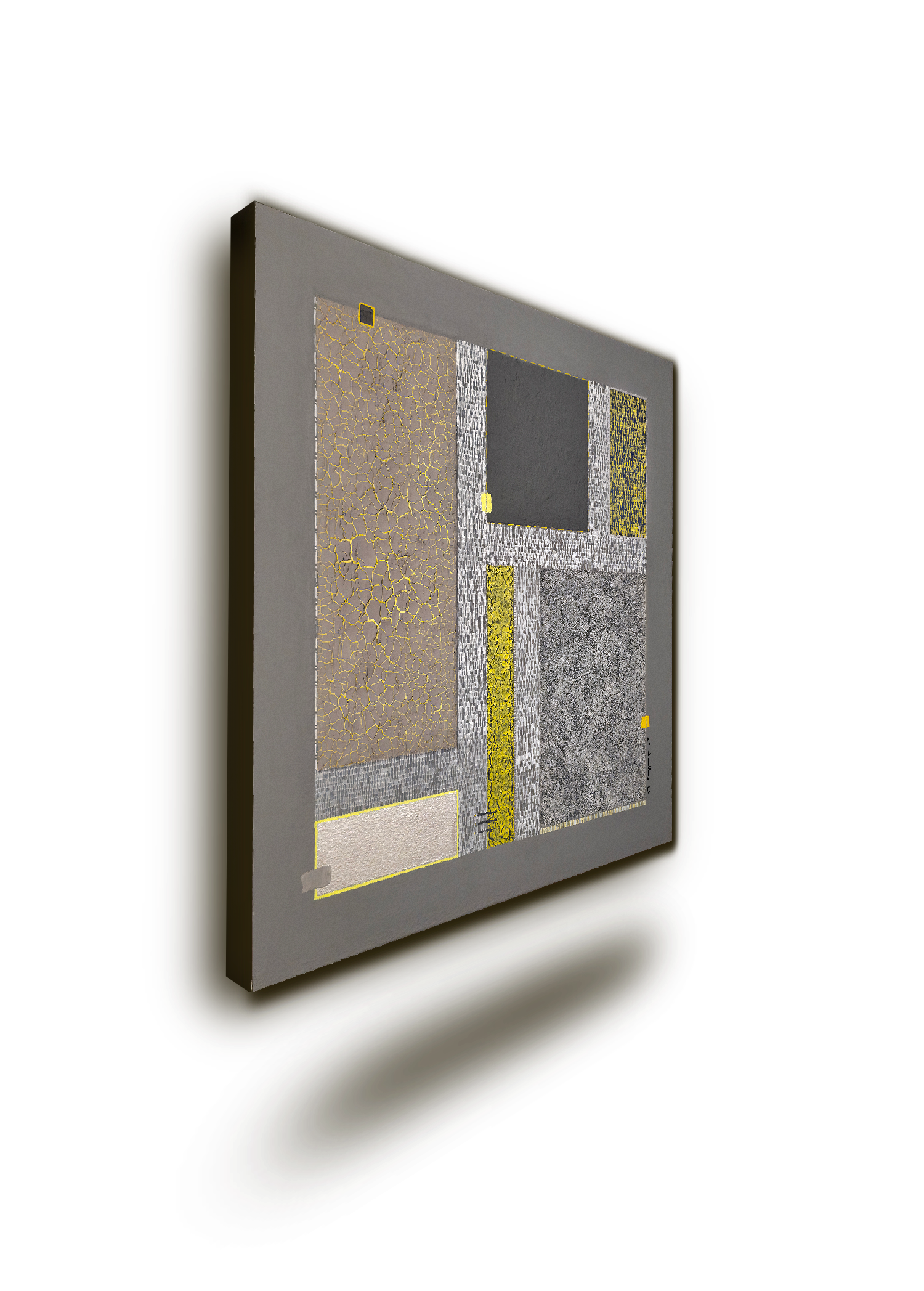 La composition de la toile se déploie avec une rigueur architecturale. Un gris vibrant occupe le centre de la narration visuelle, tandis que les plans s’articulent autour de textures rocheuses et de superpositions complexes. Des traits de lumière viennent ensuite structurer les masses sombres pour y apporter une clarté graphique presque chirurgicale. En effet, ce jeu de matière offre une profondeur que chaque variation d’éclairage vient révéler au fil de la journée, transformant l’œuvre selon l’angle de vue.